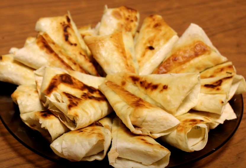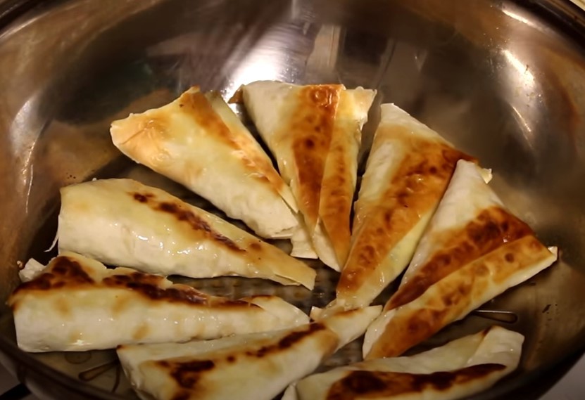 Конвертики из лаваша с сыром и колбасой на сковороде