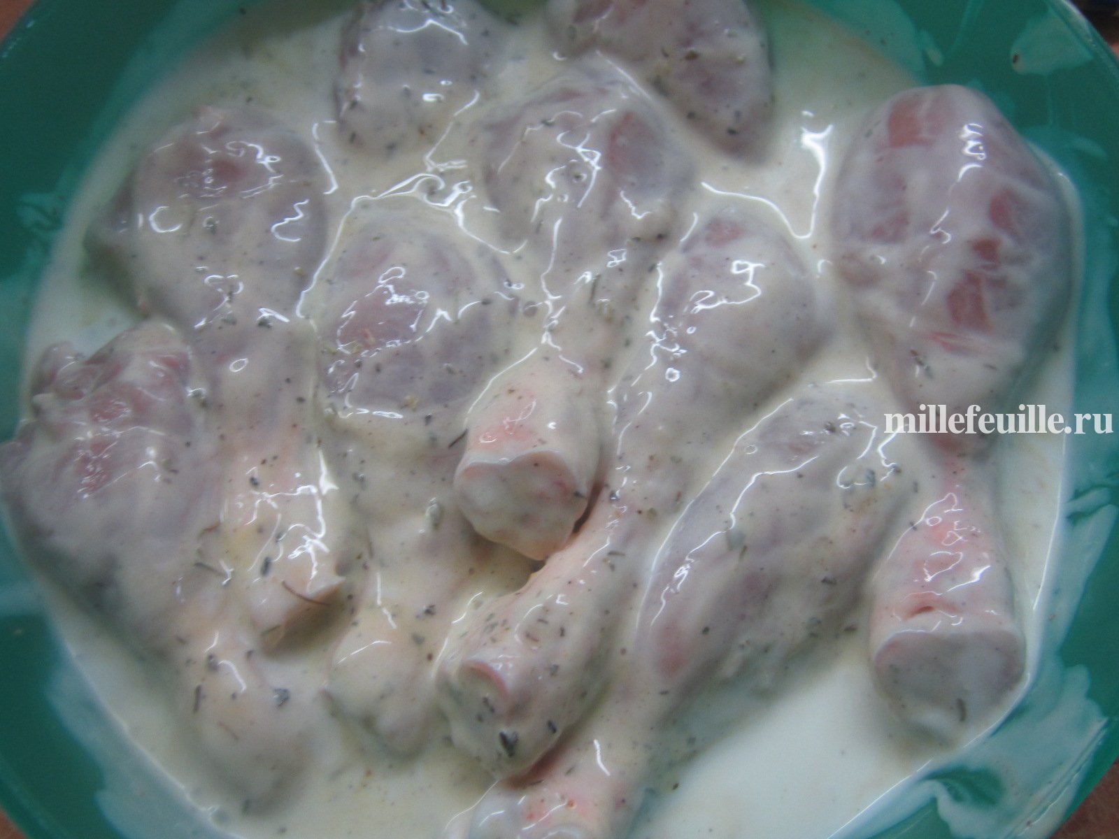 - Вымытые и обсушенные голени натирают солью со специями, добавляют кольца лука, заливают кисломолочной основой и оставляют мариноваться.
