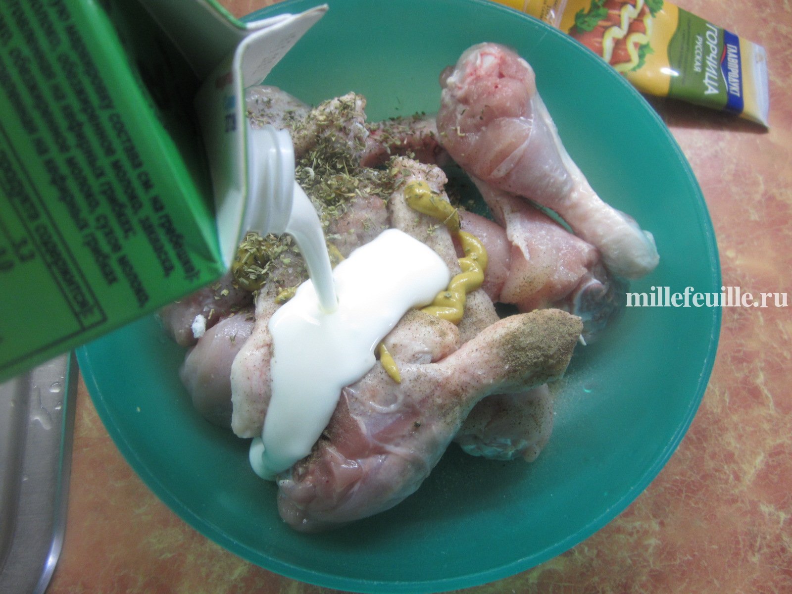5. Затем выложить замаринованные куриные ножки в кефире с горчицей в жаропрочную форму и поставить запекаться в духовку, разогретую до 190 градусов, примерно на 40-50 минут.