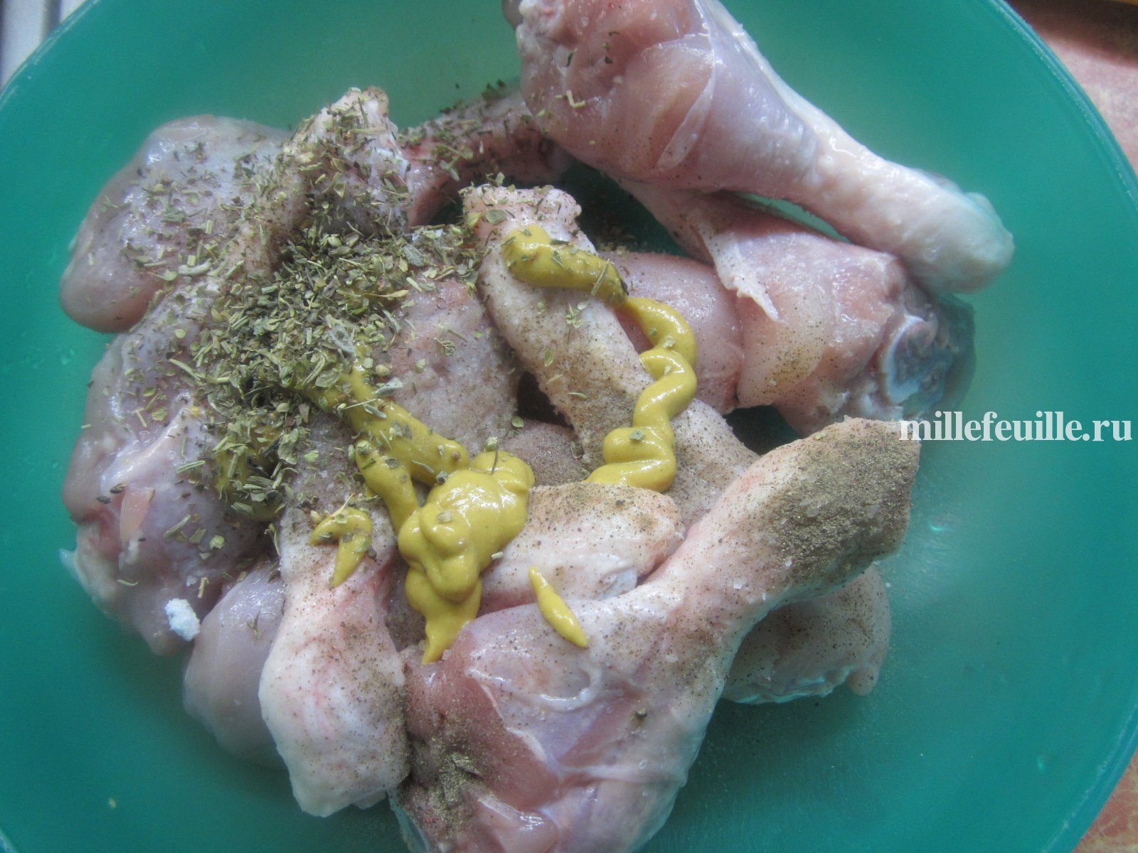 2. Добавить к курице специи, пропущенный через пресс чеснок, горчицу, соль и перец, перемешать.