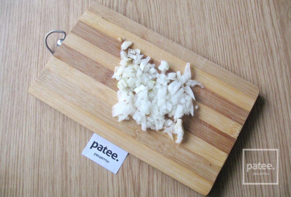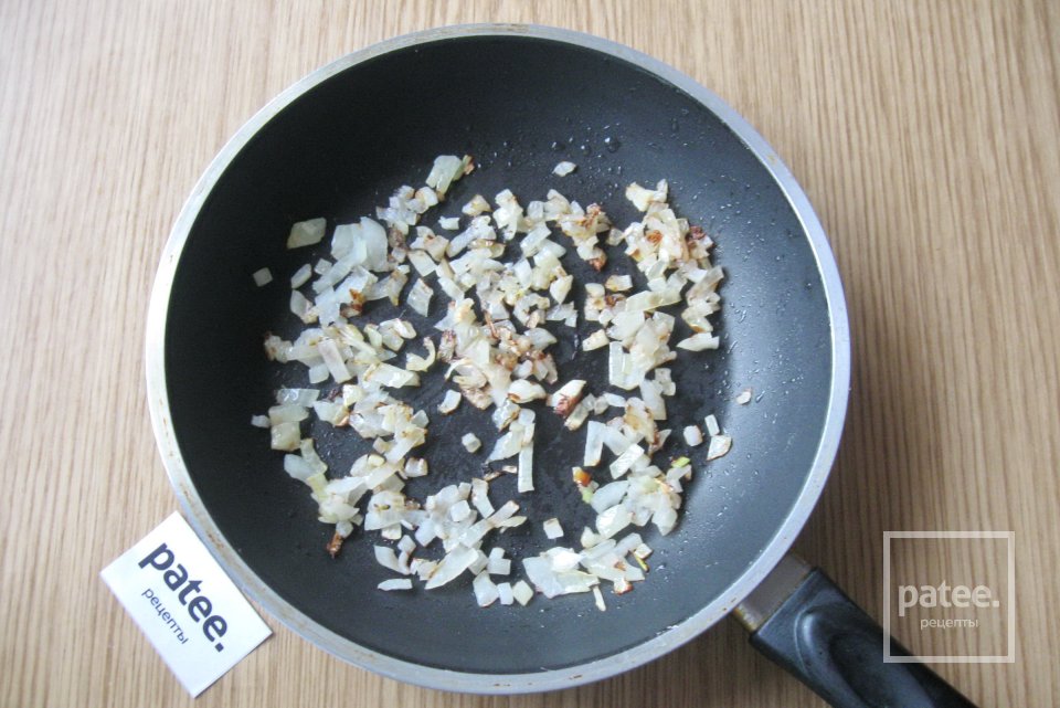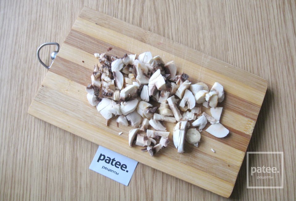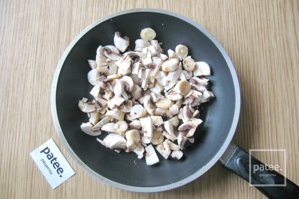 Шаг 1. Порежьте лук на четвертинки и обжарьте на подсолнечном масле до мягкости. Затем положите нарезанные шампиньоны и жарьте, пока не подрумянятся. Заправьте специями.