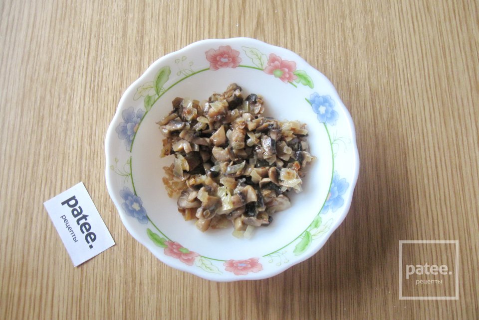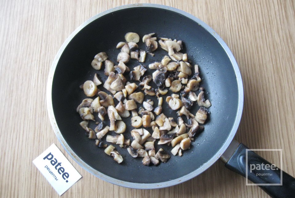 Вымыть и обжарить грибы, измельчить лук и добавить в сковороду к шампиньонам. После того, как выпарится вся жидкость, снять с огня.
