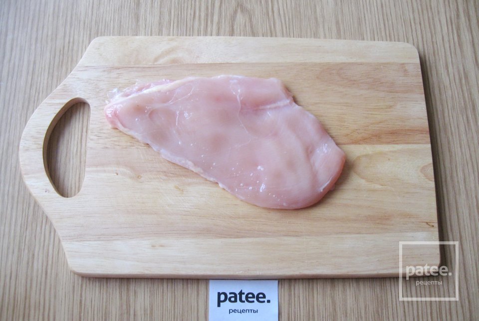 1. Вымойте куриное филе и подсушите бумажным полотенцем. Затем разрежьте каждый кусок вдоль и отбейте, накрыв пищевой пленкой или пакетом, чтобы не забрызгать пространство вокруг.