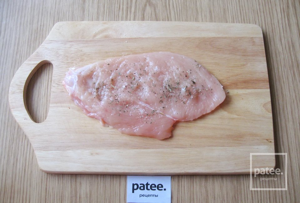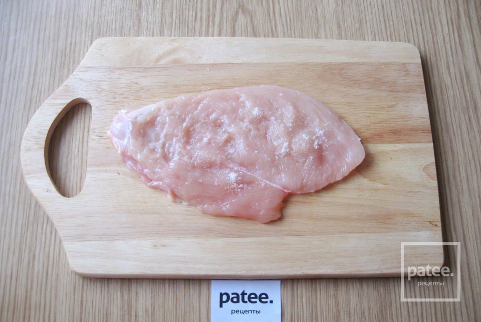 - Куриное филе разрежьте вдоль на две части, аккуратно отбейте. Приправьте солью и перцем;