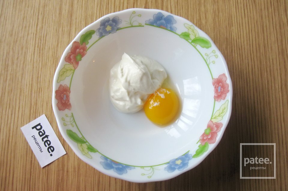 - Приготовьте кляр: в миске соедините яйца с крахмалом, майонезом, перемешайте;