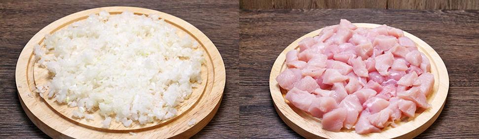 - Для приготовления начинки картошку и курицу нарезать мелкими кусочками, лук тоже мелко нашинковать, сыр превратить в стружку при помощи терки.