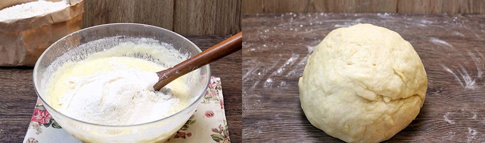 - Для получения не слоеного теста в кефир насыпать соды, соли, тщательным образом перемешать. Следом влить растопленное и остуженное сливочное масло. Постепенно, небольшими частями ввести просеянную муку, тщательно перемешивая ложкой массу. Когда консистенция станет густой, выложить тесто на стол и замесить вручную. Оно должно быть мягким и легко отстающим от рук. Поместить тесто в миску и отправить в холодное место на 40-60 минут.