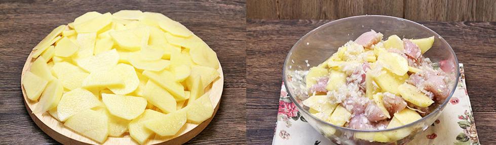 - Нарезать небольшими кусочками 300 г куриного филе и добавить в миску к картофелю. Все перемешать, посолить и поперчить по вкусу. При желании, приправить куркумой и паприкой.