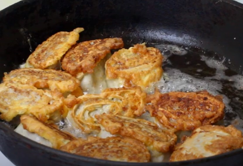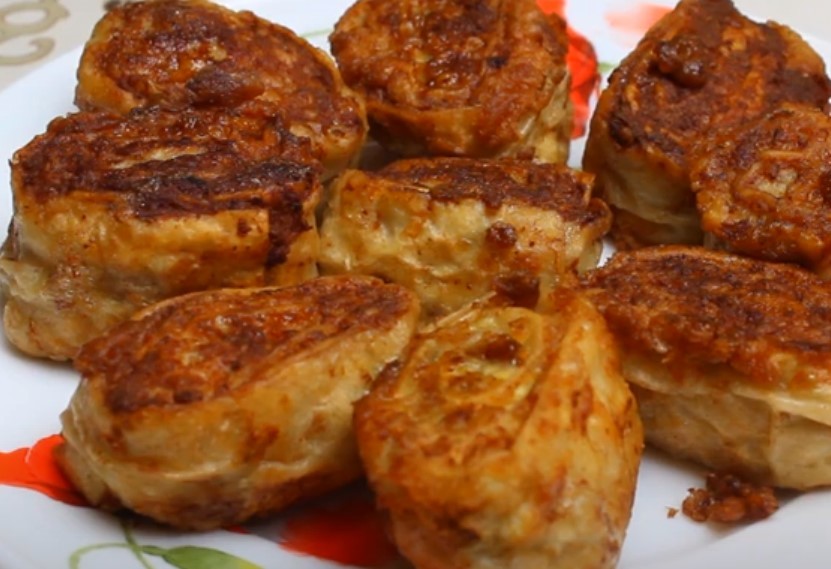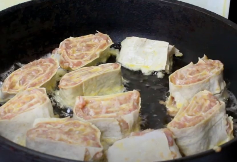 - На сковороде следует разогреть растительное масло, и обжарить в нем рулеты с двух сторон до золотистой корочки.