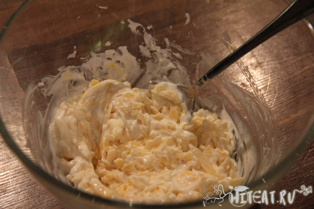 1. Сыр натираем на крупной терке, добавляем йогурт или сметану (что есть под рукой). Можно, конечно, и майонез добавить, особенно если он домашний.