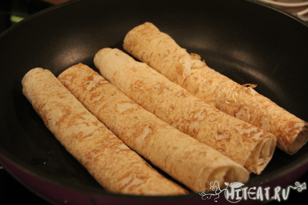 Рецепт простейший, а результат очень даже впечатляющий. Если совсем в двух словах: подготавливаем начинку, заворачиваем ее в лаваш и обжариваем на сковороде. Сейчас немного поподробнее.