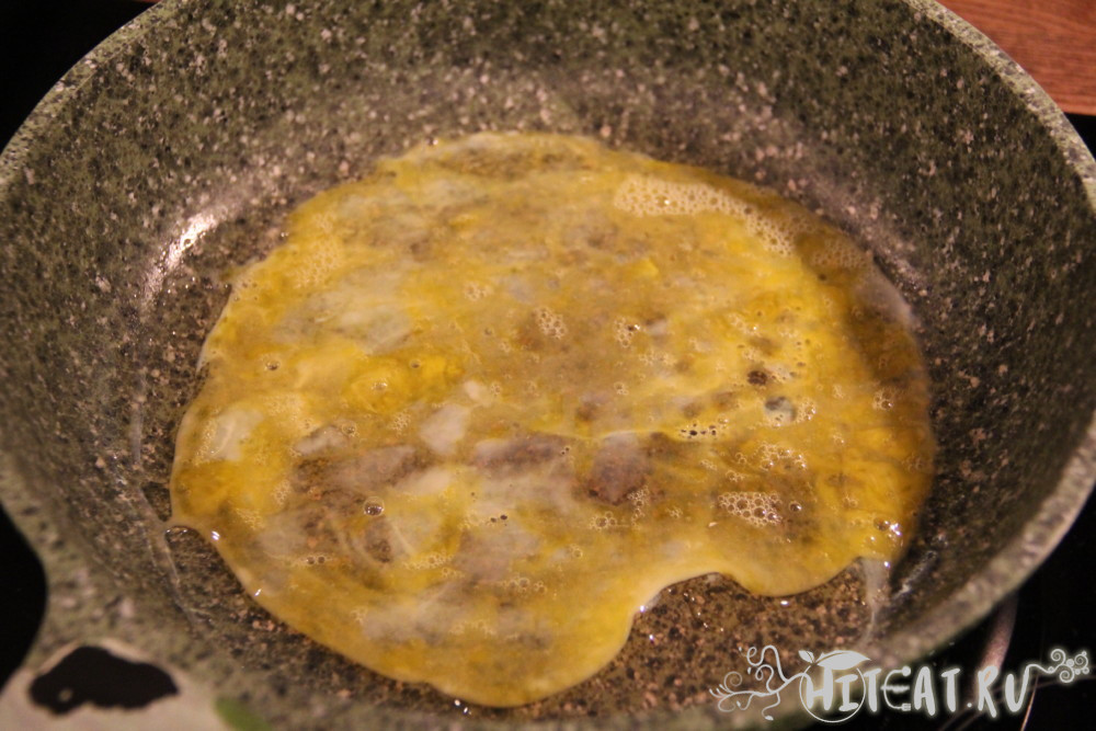 1. В хорошо разогретую сковороду наливаем несколько капель растительного масла. В отдельной мисочке разбалтываем яйцо и выливаем его на сковороду. Стараемся, чтобы яйцо полностью заполнило дно сковороды. Получается такой яичный блинчик. Если сковорода хорошо разогрета, яичный блин схватывается практически на глазах.
