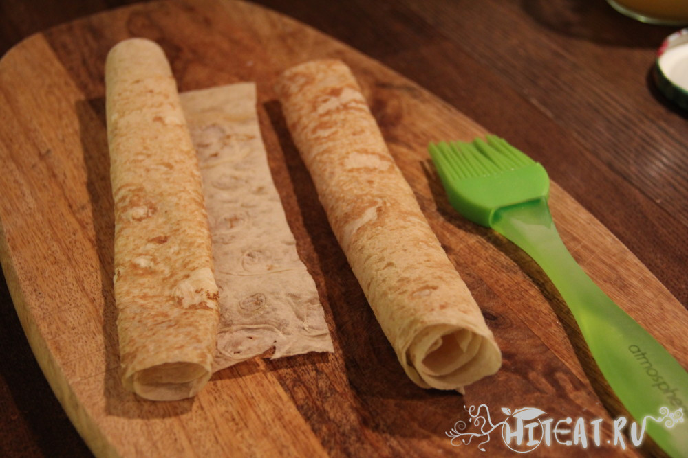 Скручиваем рулетики. Для того, чтобы лаваш скрепить, можно края квадрата смазать обычной водой, используя силиконовую кисточку. Тогда уж точно ничего не развалиться.