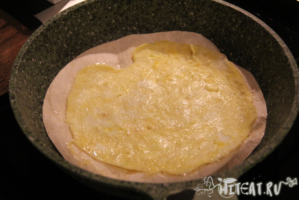 2. Пока еще верх у блина жидкий, кладем поверх него кружочек лепешки. Лаваш должен прилипнуть к яйцу. Можно помочь ему, пройдясь аккуратно ложкой по всему диаметру круга. Буквально 1-2 минуты и идем дальше.