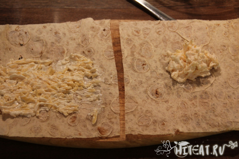 - Сметану смешать с плавленым сыром. Лаваш смазать сметанно-сырной массой.