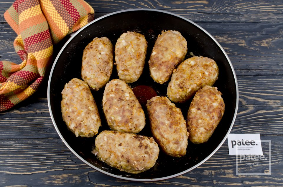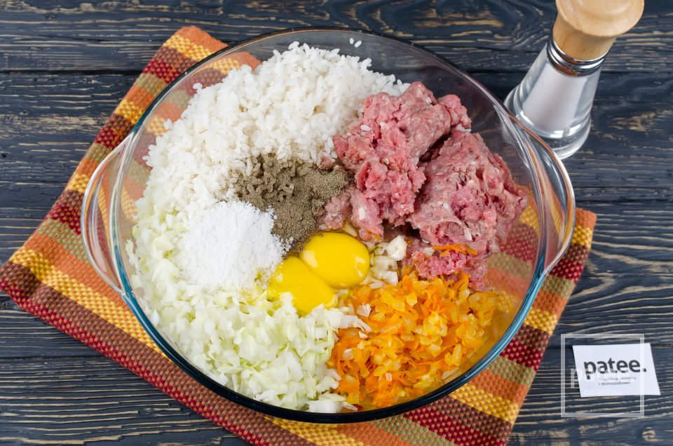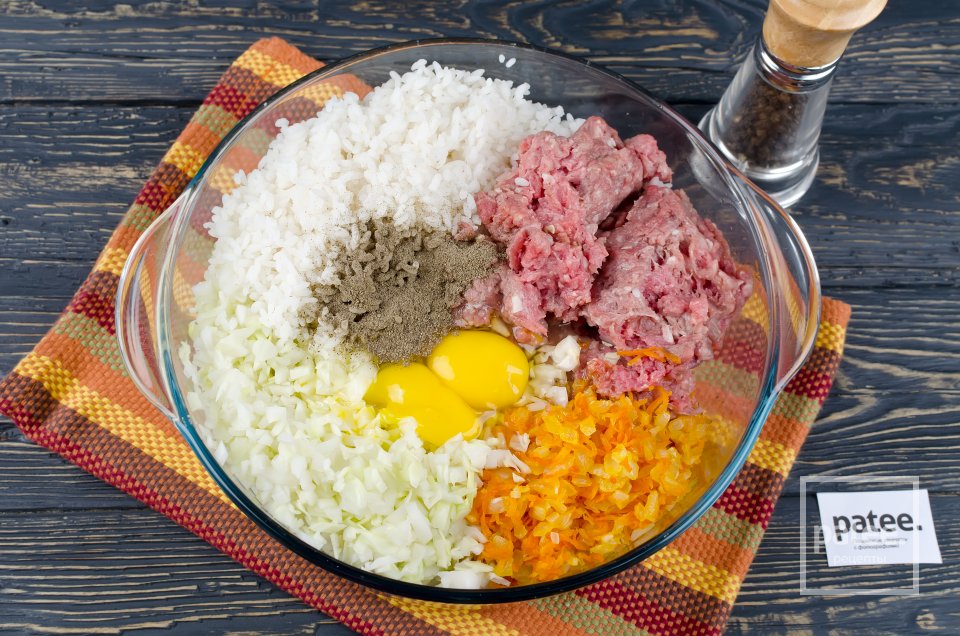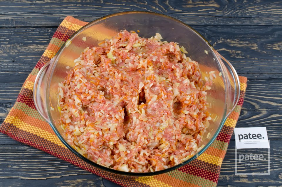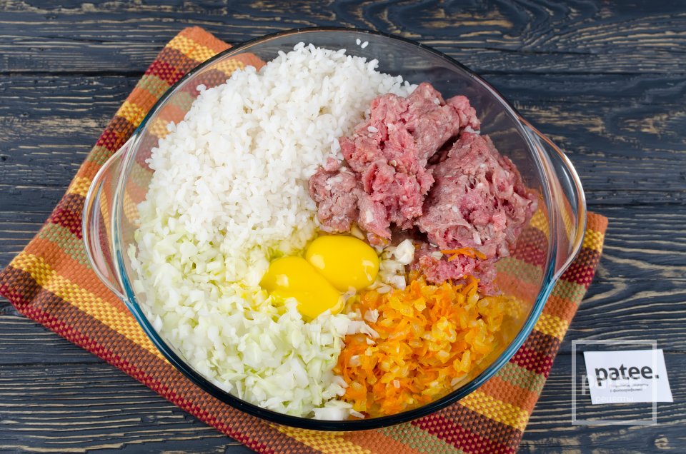 - 1. Фарш смешивают с мелко нарезанной луковицей и вареным рисом, солят.