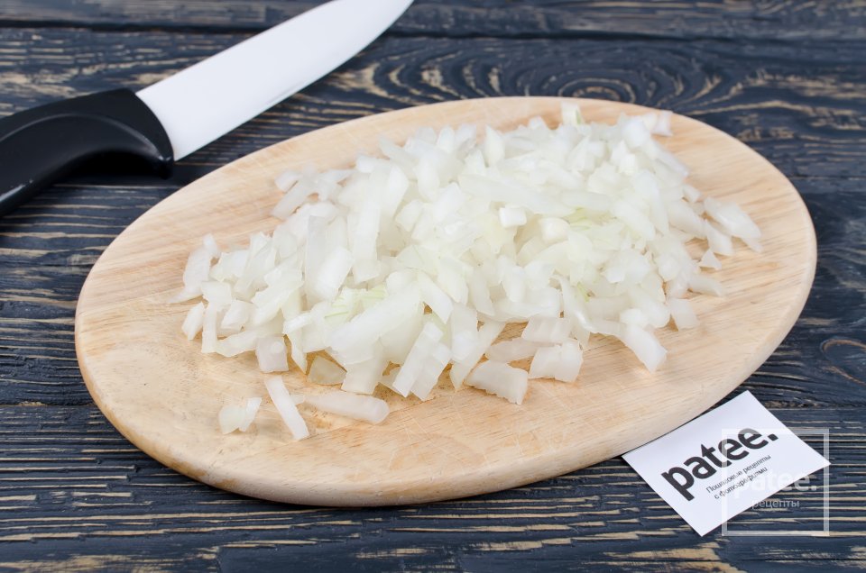 - 4. Одну луковицу порезать мелкими кубиками и добавить в фарш.