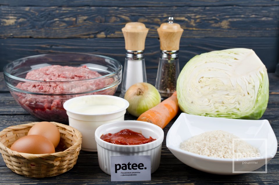 Для приготовления ленивых голубцов нам потребуется: мясной фарш, капуста, рис, яйца, соль, черный молотый перец, морковь, лук, сметана и томатная паста.