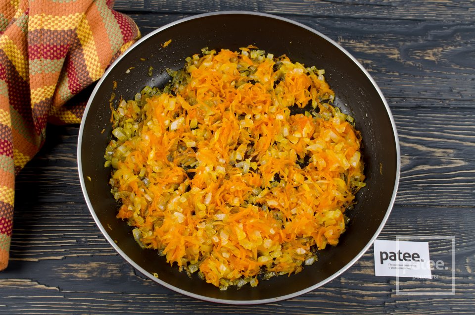 Обжарьте лук и морковь вместе на сковороде на растительном масле.