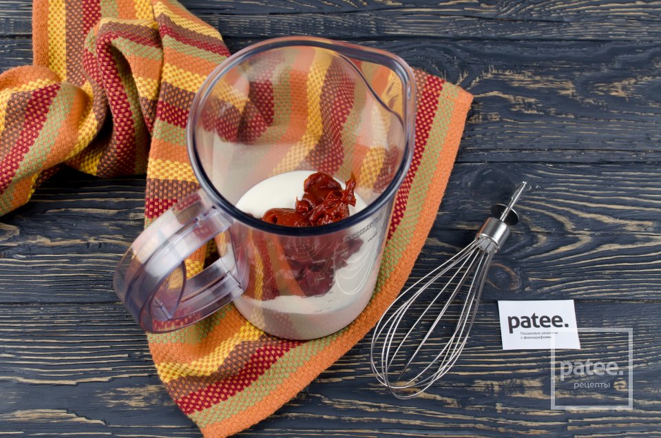 Приготовим заливку. Соедините вместе сметану и томатную пасту.