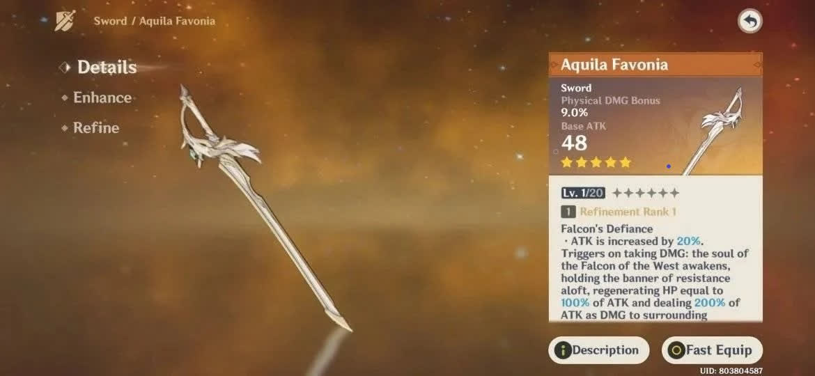 Меч сокола — лучшее оружие для Кэйа-дамагера. Этот пятизвездочный клинок повышает атаку на 20 процентов. А если по герою пройдет урон, пробудившаяся в стали душа Сокола Запада восстановит хитпоинты в количестве 100 процентов от силы атаки, а также нанесет окружающим урон в размере 200 процентов от силы атаки. Эффект появляется каждые пятнадцать секунд — он заметно повышает выживаемость не слишком танкового Кэйа, а также добавляет урон по площади.