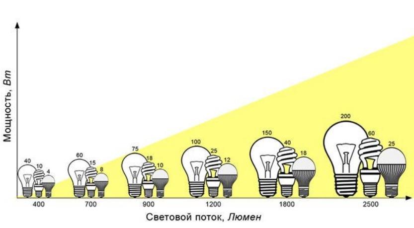 | Световой поток в Лм | Лампы накаливания (Вт) | Светодиодные варианты (Вт) | Люминесцентные лампы (Вт) |
