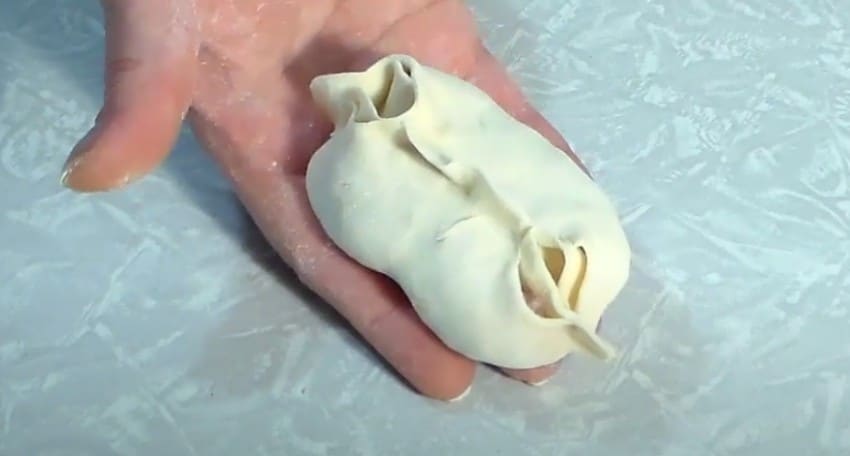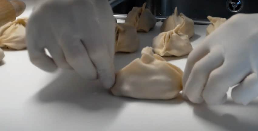 - Начнем лепить наши манты. Перед лепкой заготовки надо перевернуть, поскольку сторона, которой они лежали вниз, более липкая.