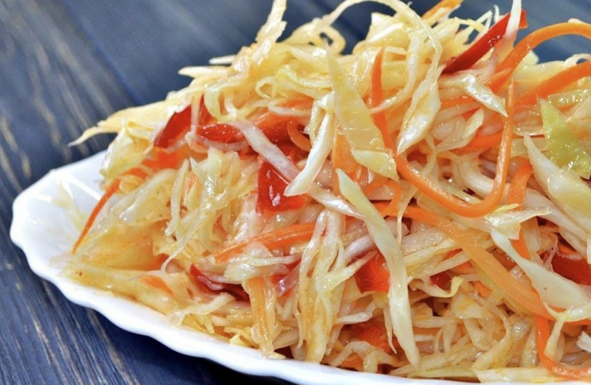 Капуста по этому рецепту готовится за 2 часа, поэтому если результат нужен быстро, обратите внимание на рецепт с болгарским перцем. Салат получается красивым и имеет необычный, сладковатый вкус