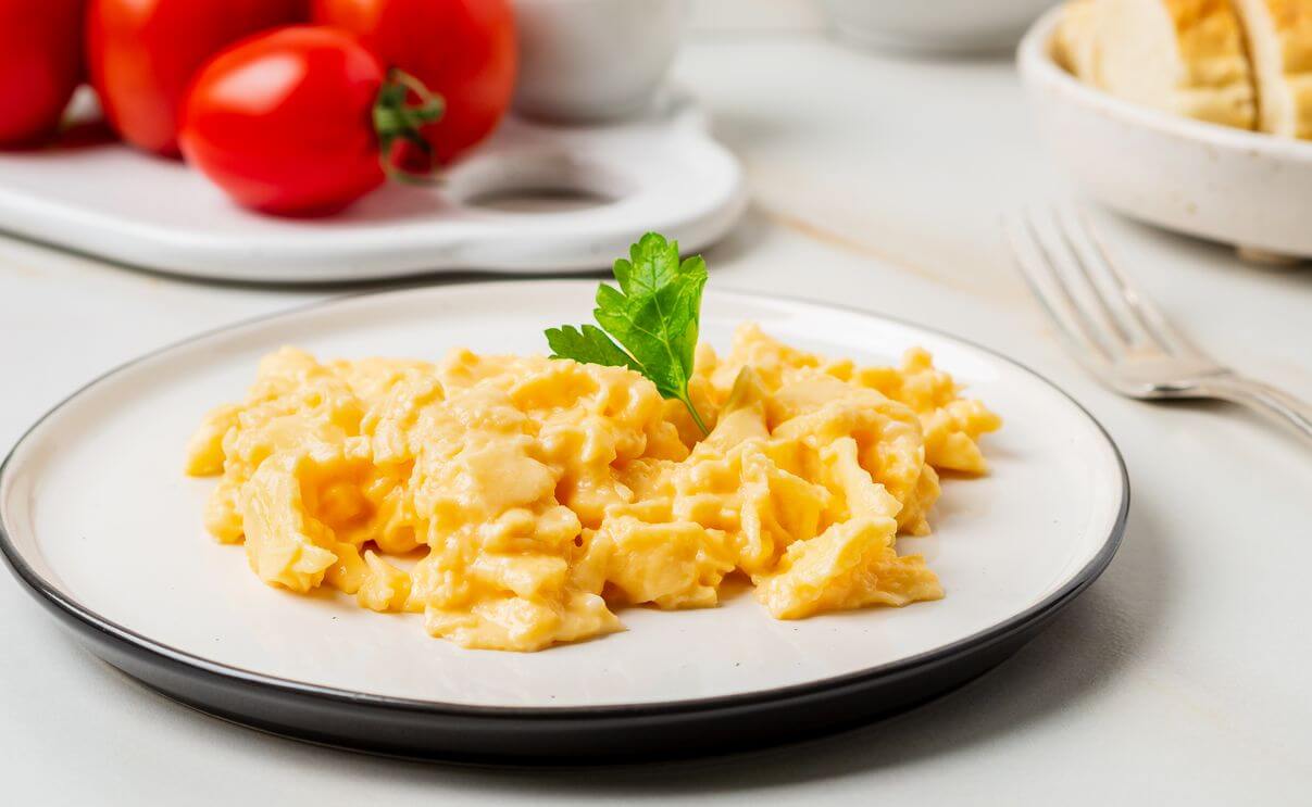 На обед можно приготовить овощной омлет из двух яиц. Для него взбить яйца, добавить в них порезанный дольками помидор. Массу вылить в сковороду, смазанную сливочным маслом, и готовить на среднем огне 2-3 минуты. Омлет подавать к столу с тостом из цельнозернового хлеба.