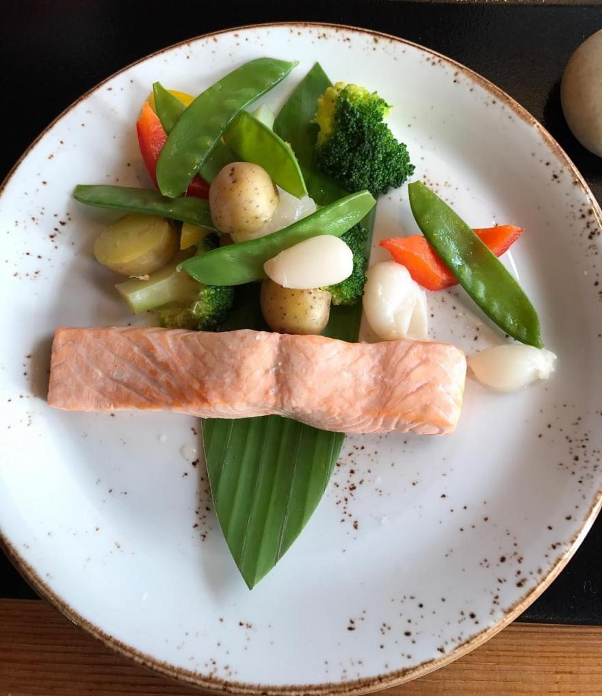 Обед (3 балла) — рыбный суп, паровые тефтели из телятины, спаржа, кусочек хлеба с отрубями.