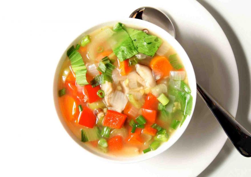- отварить лёгкий куриный бульон (мясо можно использовать на второе), добавить соцветья брокколи, цветной капусты, порезать белокочанную, сладкий перец, помидор, кабачок, немного лука, довести до готовности. Перед подачей супчика положить нашинкованную зелень.
