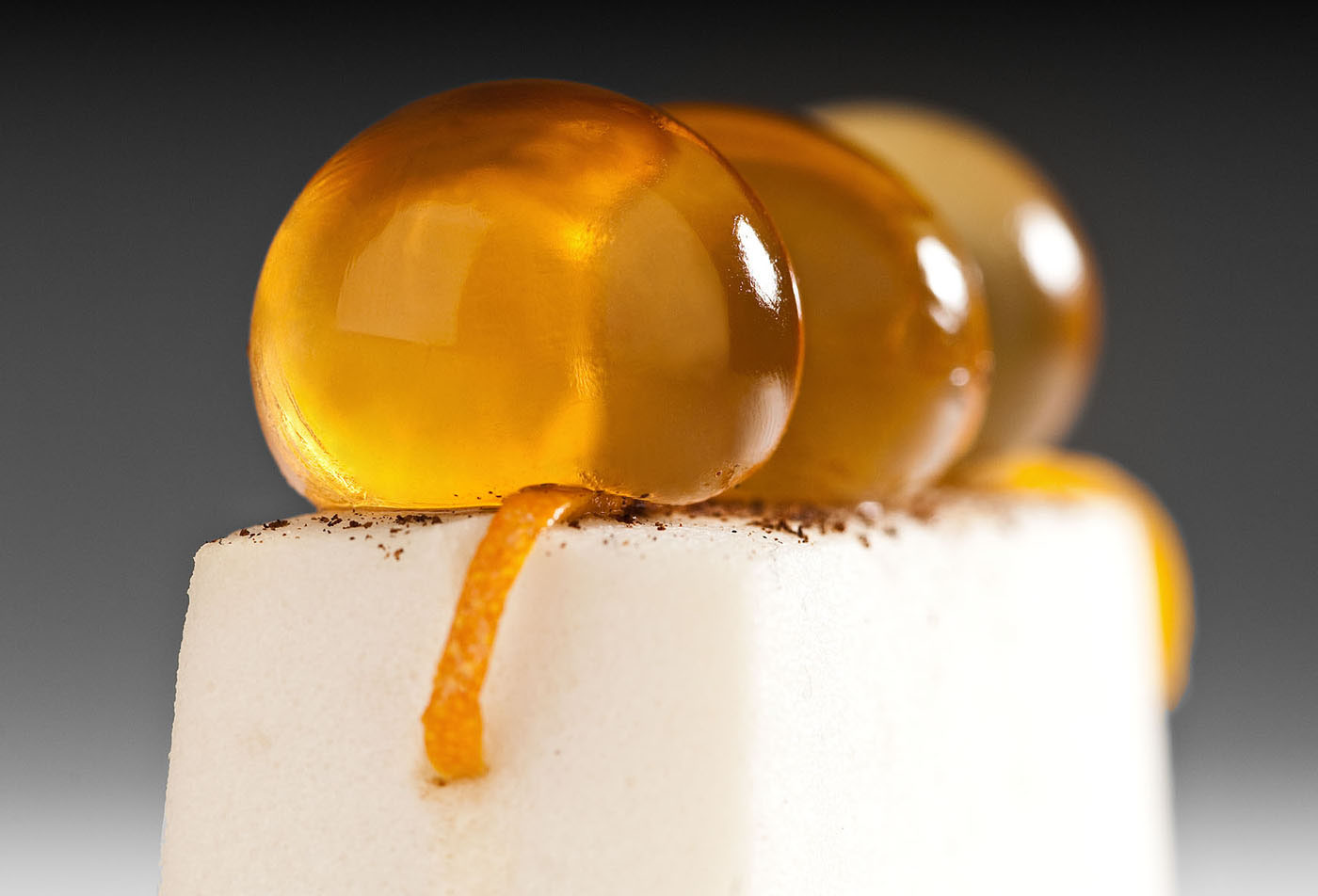 Это превращение продуктов в гелевые шарики, с помощью желатина или альгинатов. И если раньше этот трюк был использован, чтоб создать дешевый заменитель икры, то сейчас маленькие сферы делают из разнообразных концентратов.
