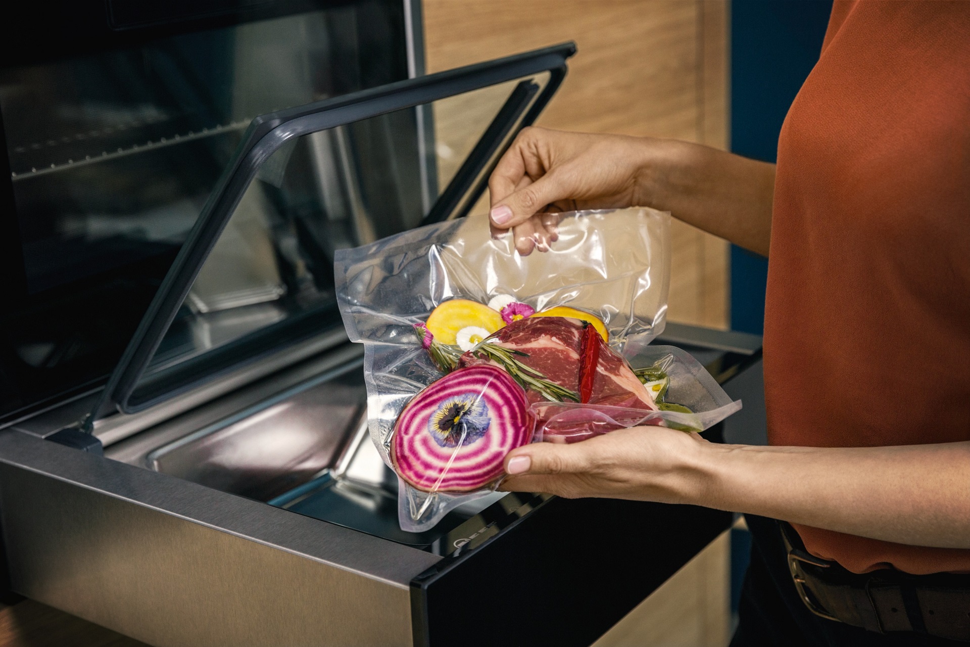 По этой технологии продукт, заранее вакуумированный, готовится на водяной бане, которая долгое время поддерживает одинаковую температуру. Чаще всего так готовят рыбу, стейки, морепродукты и овощи. После такого вида обработки продукты не меняют свой начальный вид, а вот вкус имеют в разы насыщеннее. А ещё пища при таком приготовлении никогда не подгорает. Ну не чудо ли?