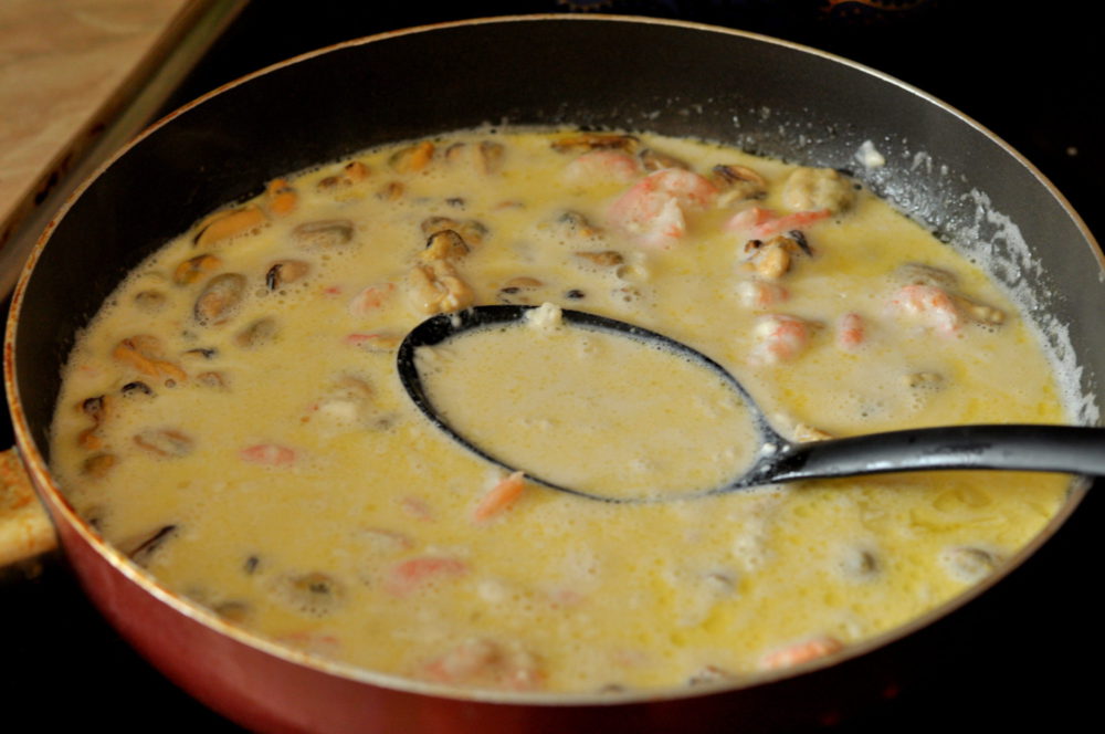 Паста с морепродуктами под острым сливочно-сырным соусом: