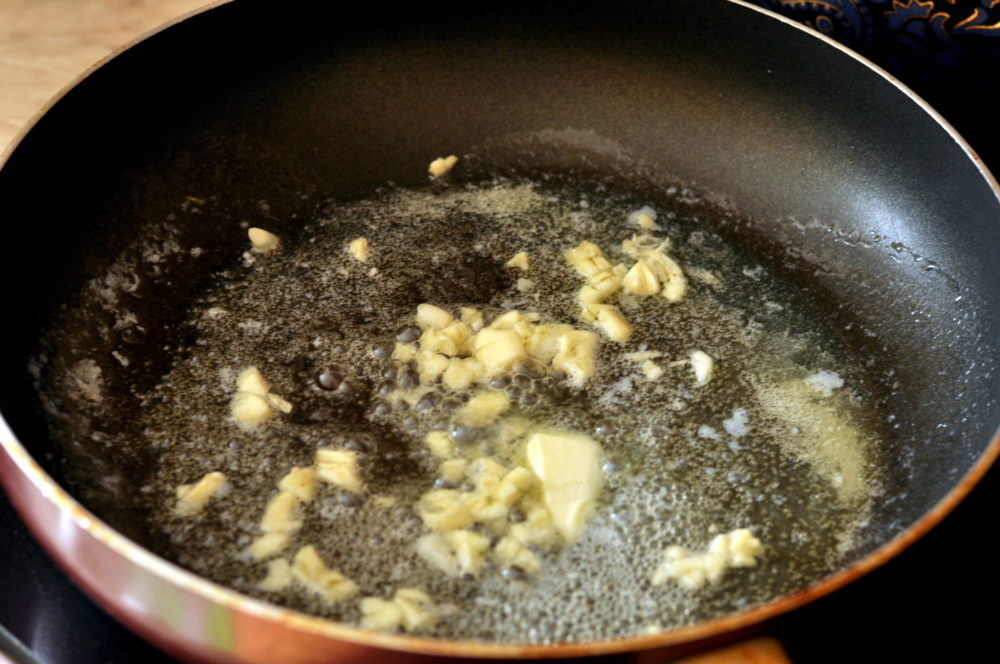 - Приготовьте соус для морского коктейля. Для этого чеснок надо очистить и нарезать пластинками. На сковородке немного разогреть смесь масел. В них нужно томить чеснок на умеренном огне одну минуту. Затем чеснок убирается со сковородки.