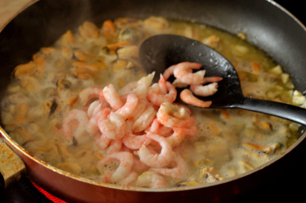 5. Выложить морепродукты и готовить 2 минуты при перемешивании, только чтобы они хорошо прогрелись.