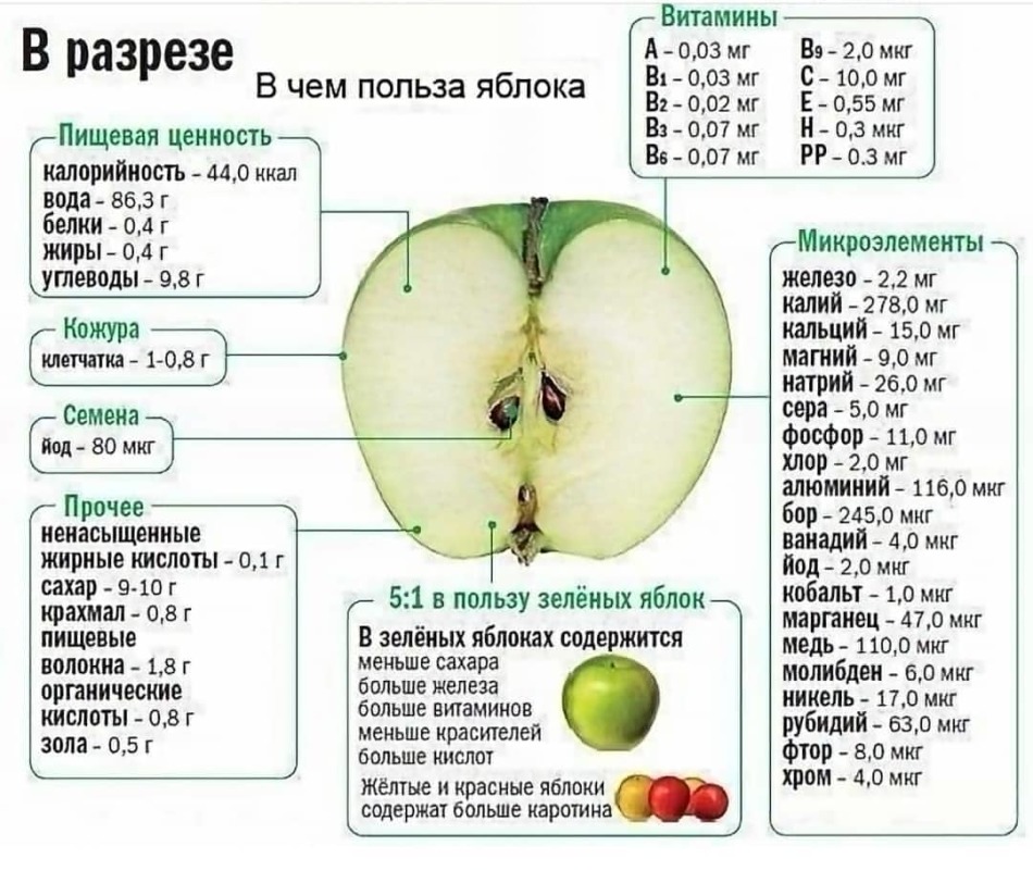 - В яблоках содержится широкий спектр витаминов и микроэлементов.