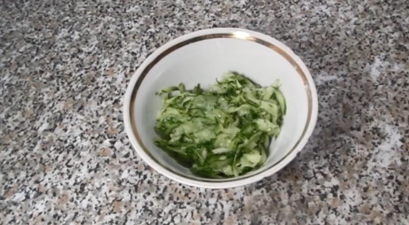 - Соленый огурец так же, как и морковь трем на корейской терке.