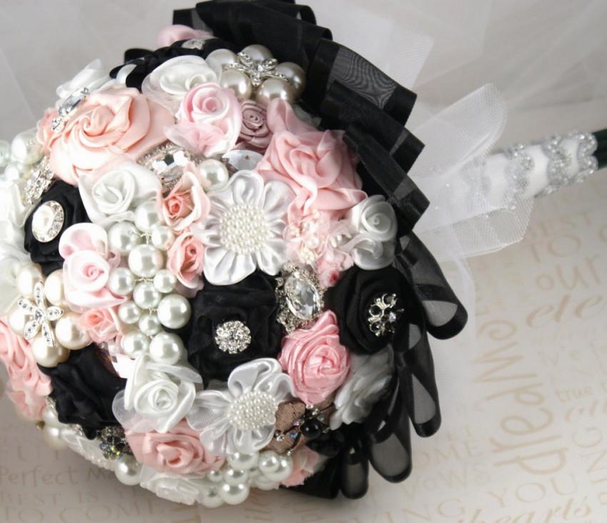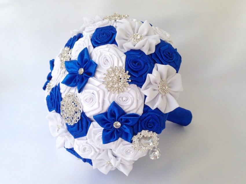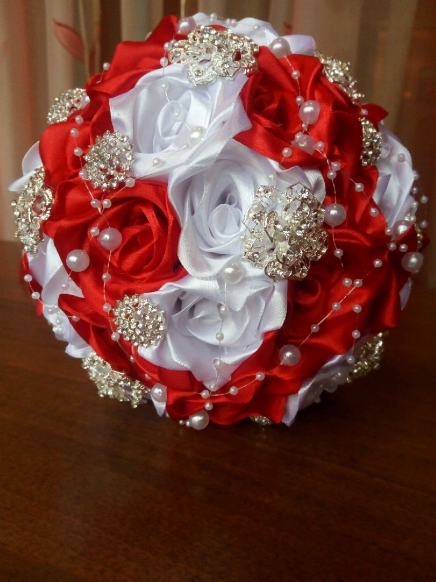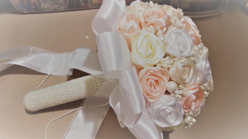 Букет из атласных цветов выглядит стильно и модно. В свадебном салоне можно приобрести композицию из искусственных цветов, которая смотрится не хуже стандартных вариантов.