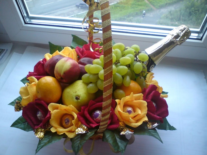 Не забываем, что поделка из цветов собранная своими руками имеет большой срок хранения, если к ней бережно относиться. При создании подарка из живых растений, следует выбирать только самые свежие экземпляры, в противном случае он простоит не долго. То же самое следует учитывать при сборке фруктовых поделок, все ингредиенты должны быть свежими и без дефектов.