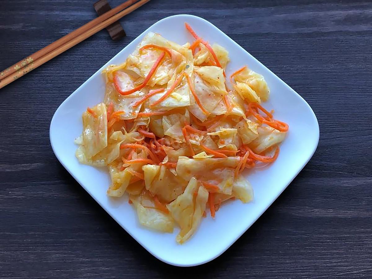 Тебе понадобится:300 г белокочанной капусты, 50 мл. растительного масла, 1 ст.л. сахара, 1 ч.л. соли, 2 ст.л. уксуса 9%, 100 мл. воды, 1 ст.л. специй для корейской моркови, 1 красный перец чили, 5 соцветий гвоздики.Приготовление: