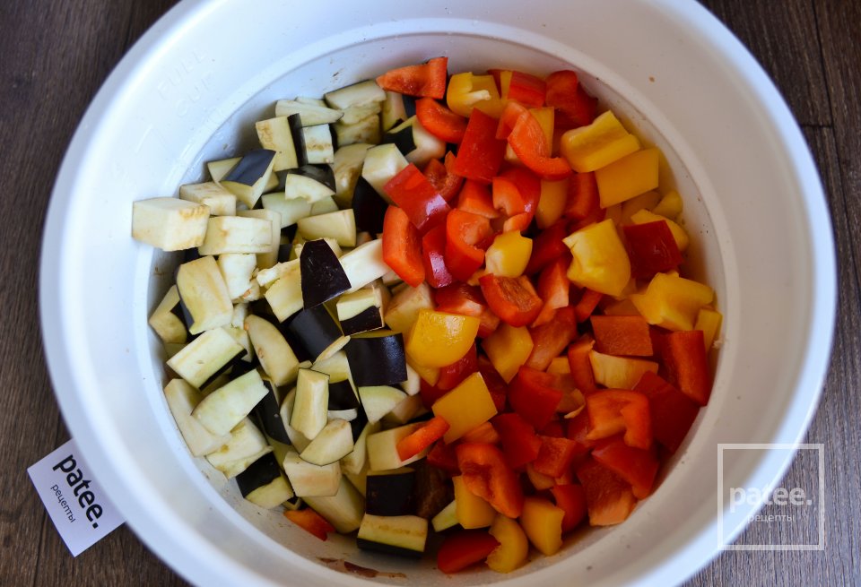 - Порубить кабачок, баклажан крупными дольками, перец брусками, а луковицу полуколечками. Морковку потереть тёрке. Уложить всё в мультиварку.