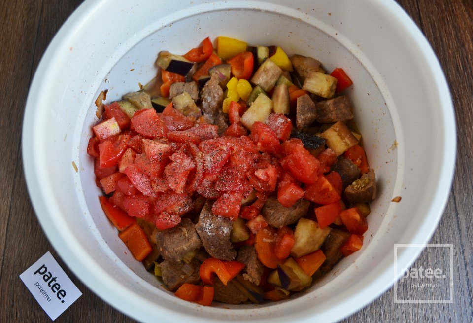 - Положить баклажаны, томатную пасту, мультистакан воды и посолить. Включить режим «Тушение» на 12-13 минут.