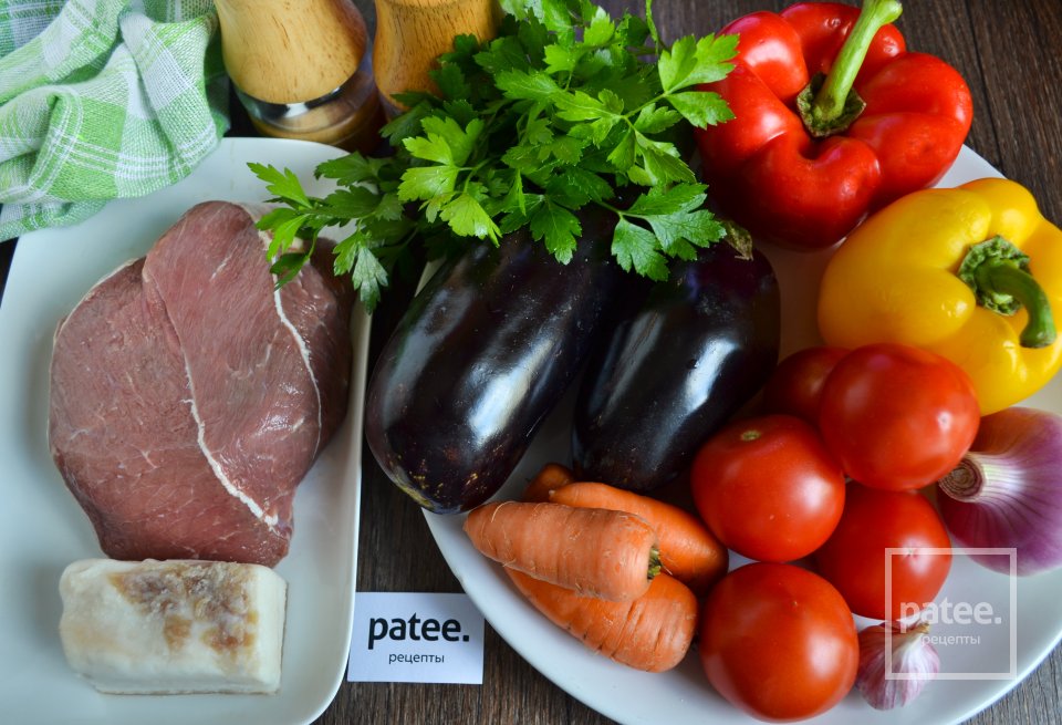 Мясо промыть и порезать довольно мелко. Лук и морковку помельчить. Картошечку, цуккини, перец и баклажан почистить и порезать некрупными кубиками.