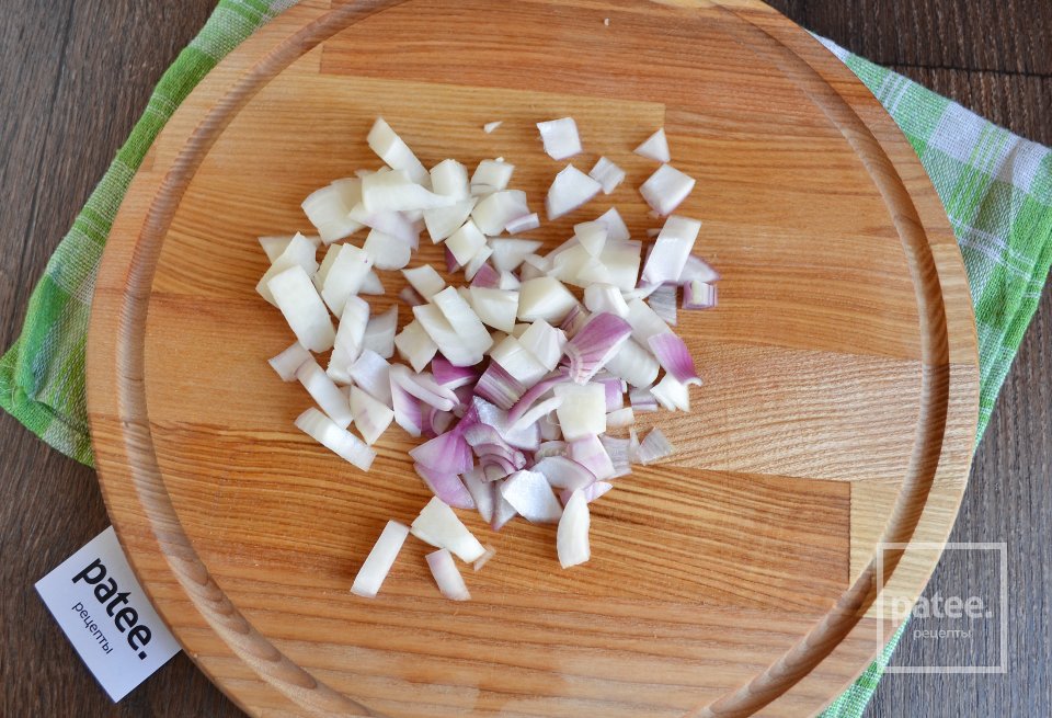 - Нарубить луковицу тоненькими брусками. Измельчить чеснок. Разогреть масло в мультичаше. Обжарить лук с чесноком минуты 3.