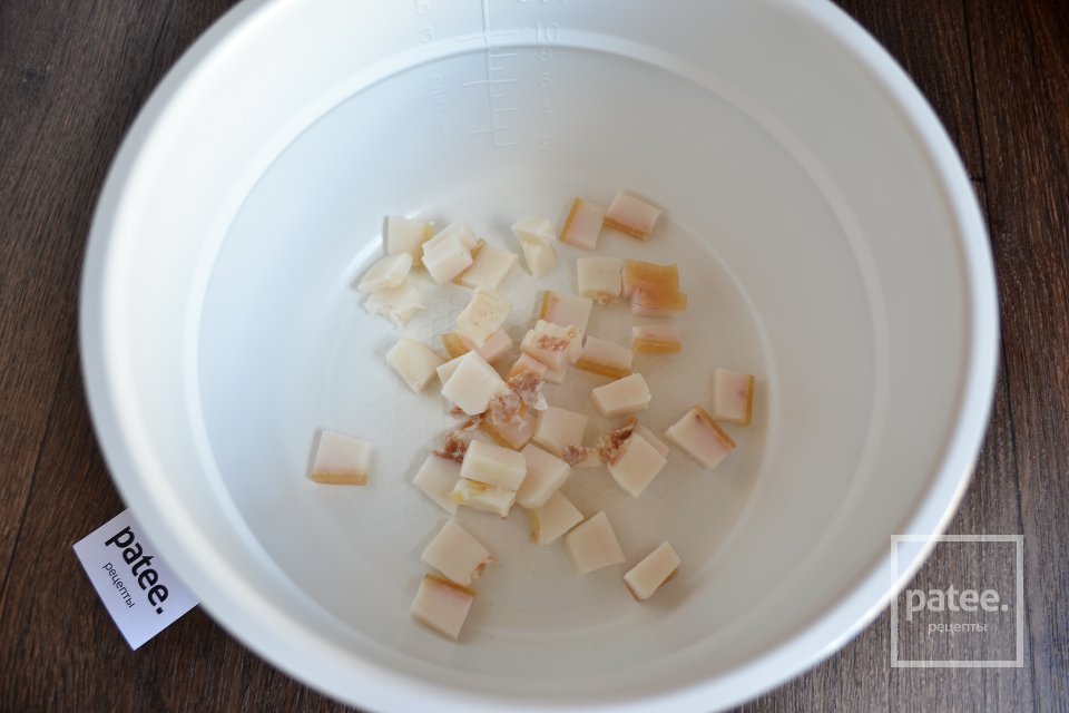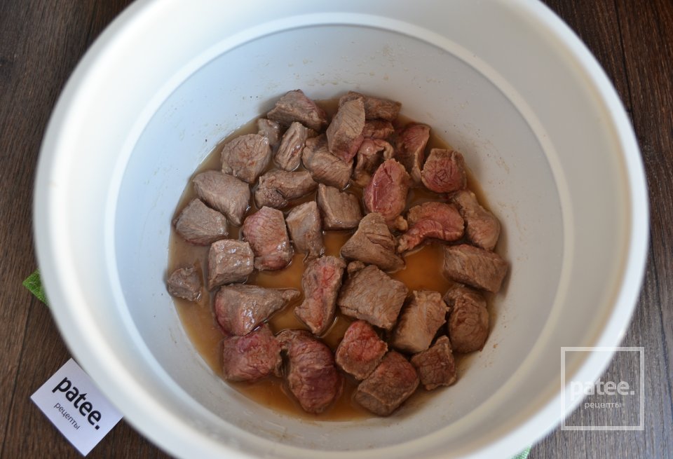 Ополоснуть мясо и порубить брусками. Пожарить на разогретом масле в мультиварке минут 11.