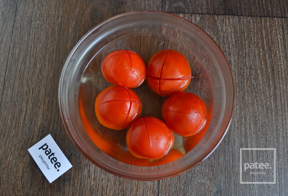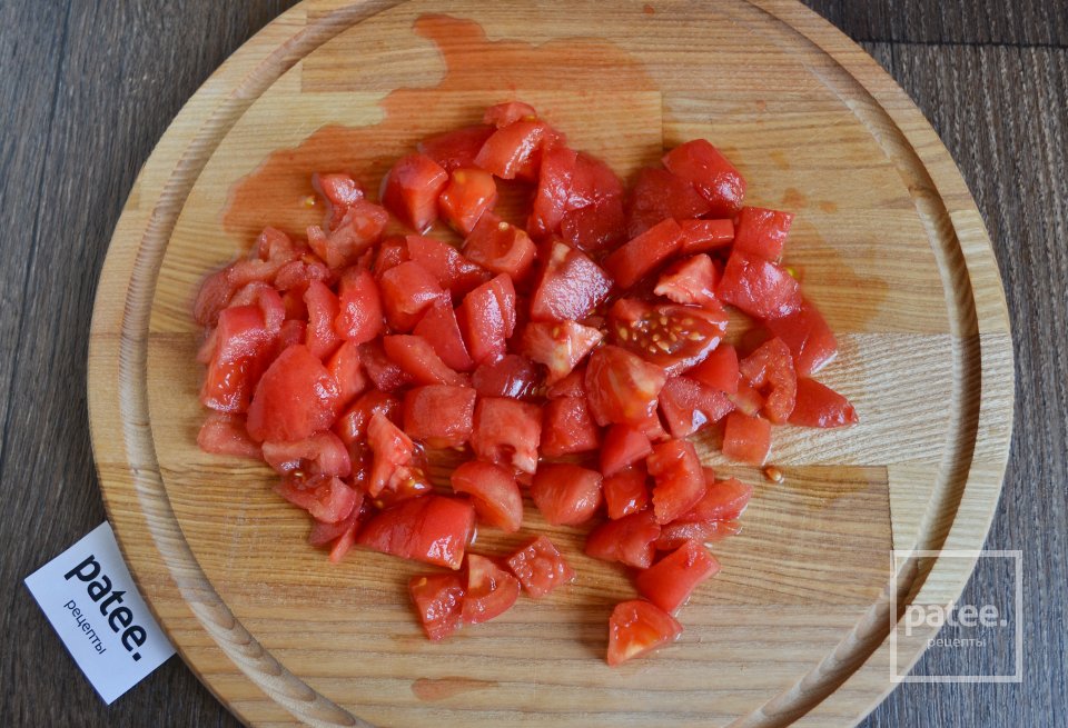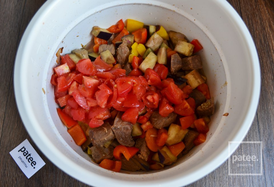 Убрать кожицу у томата, мякоть порезать. Добавить к блюду вместе с солью, перцем и мультистаканом воды