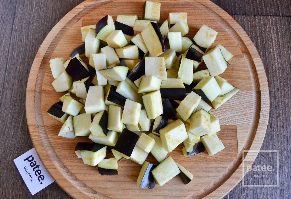 - Покрошить большими кольцами баклажан. Залить подсоленной водой на 16 минут.