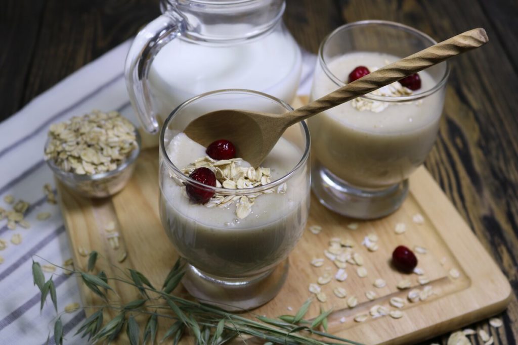 Овсяный напиток на молоке. На 100 г крупы или хлопьев берем 400 мл молока, 2 столовых ложки сахара, столовую ложку крахмала и щепотку ванилина. Молоко подогреваем до теплого состояния (не горячее 40ºС), заливаем им хлопья и оставляем продукт на четверть часа набухать. Полученный состав процеживаем через марлю и тщательно выжимаем овес, чтобы в нем не осталось молока. Жидкость разделяем на 2 части, в одной из которых разводим крахмал. Вторую часть ставим на слабый огонь, вводим ванилин и сахар, разогреваем до появления пара. Тогда добавляем молоко с крахмалом, перемешиваем. Массу следует варить после закипания до получения нужной густоты.
