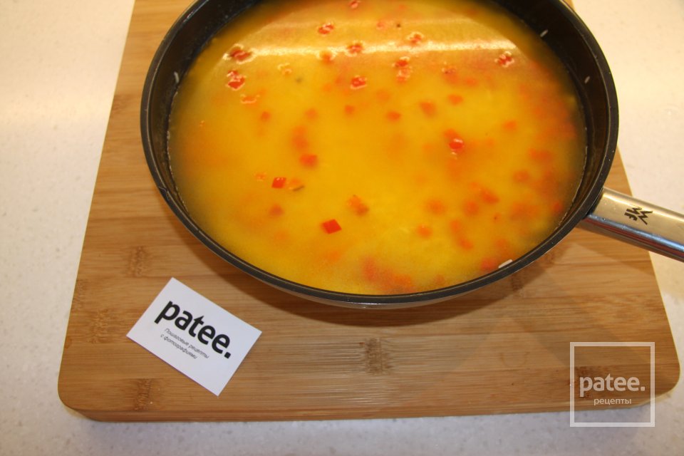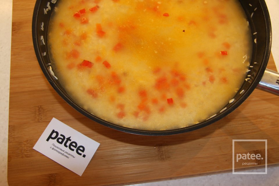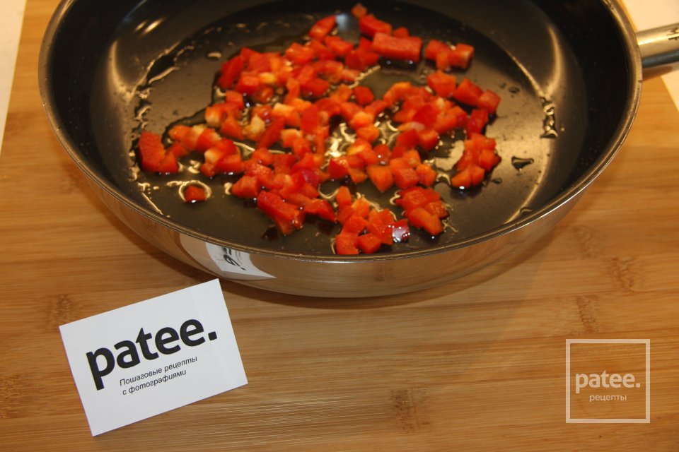 Когда чеснок подрумянится — уберите его и добавьте в сковороду нарубленный мелкими кубиками болгарский перец. Жарьте 3 минуты.